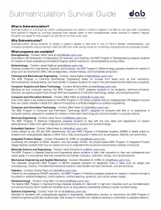 The Submatriculation Survival Guide aims to provide students with a consolidated source of information to help them understand the submatriculation process. It briefly explains what submatriculation is and when to apply, lists some of the benefits of submatriculating, summarizes the masters programs, and gives contact information for each program.